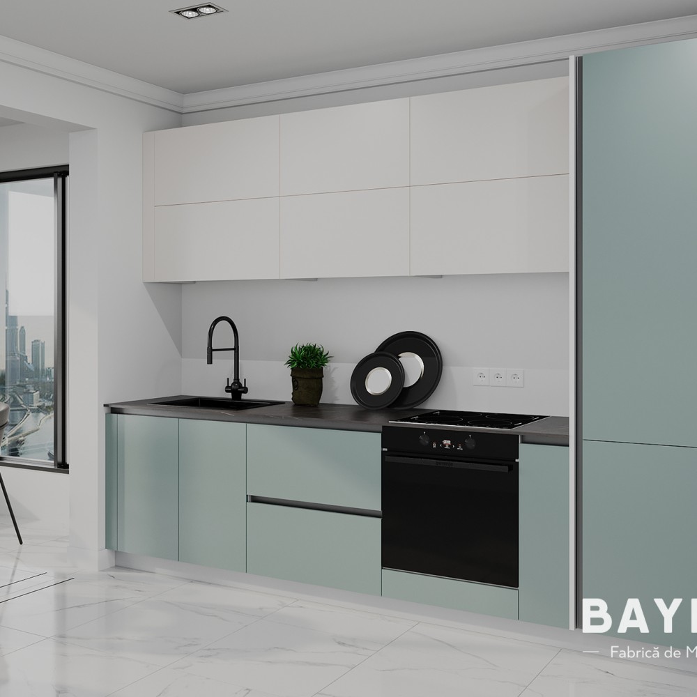 Bucătăria Monti Cucine în configurație dreaptă, cu fațade în nuanțele Light Cream și Relax Green, creează un ambient luminos, proaspăt și armonios. Combinația delicată dintre crem deschis și verde calm aduce un plus de echilibru și naturalețe spațiului. Designul modern este completat de linii curate și funcționalitate practică, oferind confort zilnic în utilizare.