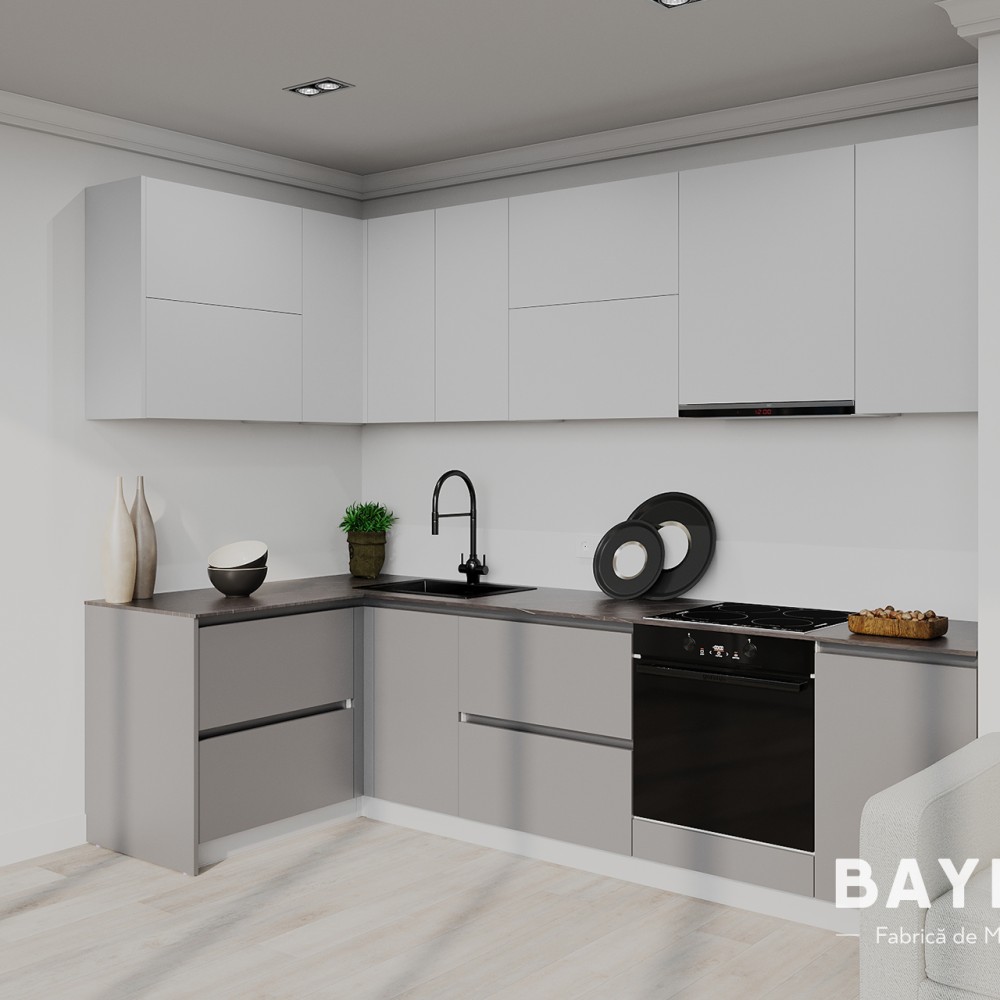 Combinația dintre Light Grey și Stone Grey oferă bucătăriei de colț un aspect modern, echilibrat și bine definit vizual. Nuanțele se completează armonios, adăugând luminozitate și profunzime spațiului. Designul minimalist este pus în valoare de fațadele fără mânere, care mențin un look curat și ordonat. Configurația de colț permite valorificarea eficientă a fiecărui centimetru, adaptând bucătăria perfect nevoilor tale zilnice. O soluție practică, elegantă și durabilă pentru un interior contemporan.