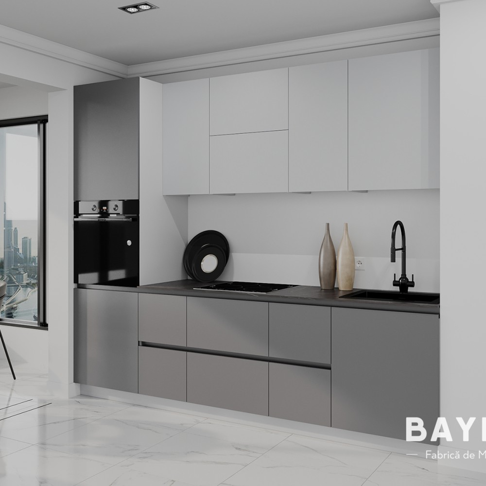 Combinația dintre Light Grey și Stone Grey creează un echilibru perfect între luminozitate și profunzime, oferind bucătăriei un aspect modern, elegant și bine structurat. Stilul minimalist este evidențiat prin liniile curate și fațadele fără mânere, care asigură un design ordonat și actual. Configurația individuală permite adaptarea bucătăriei la nevoile tale, punând accent pe funcționalitate, confort și ergonomie. O alegere ideală pentru un spațiu contemporan, practic și armonios.