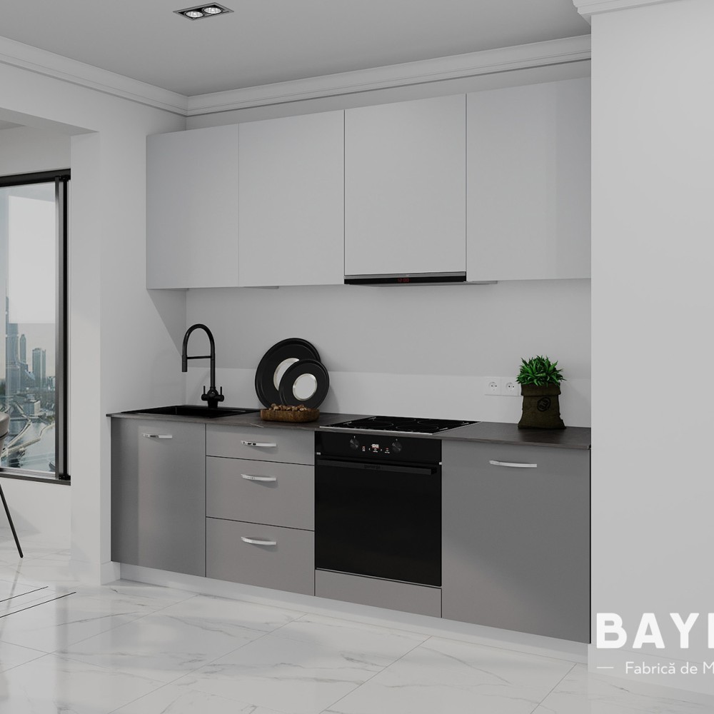 Modelul Spring Light grey / Stone grey este conceput pentru interioare contemporane, unde contează atât estetica, cât și funcționalitatea. Nuanțele de gri deschis și stone grey creează un contrast discret, iar organizarea eficientă a spațiilor de depozitare asigură confort în utilizarea zilnică.